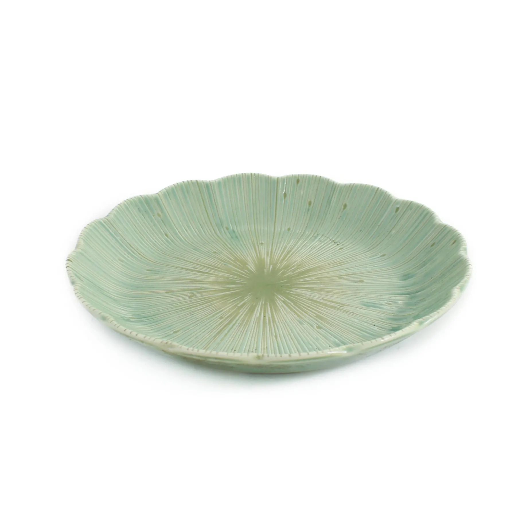 Use this green scalloped plate to serve Japanese salads and side dishes. The scalloped edges give it a unique, elegant appearance. The plate is pale green at the edges with a darker shade at the centre. It is reminiscent of an exotic leaf or delicate flower.