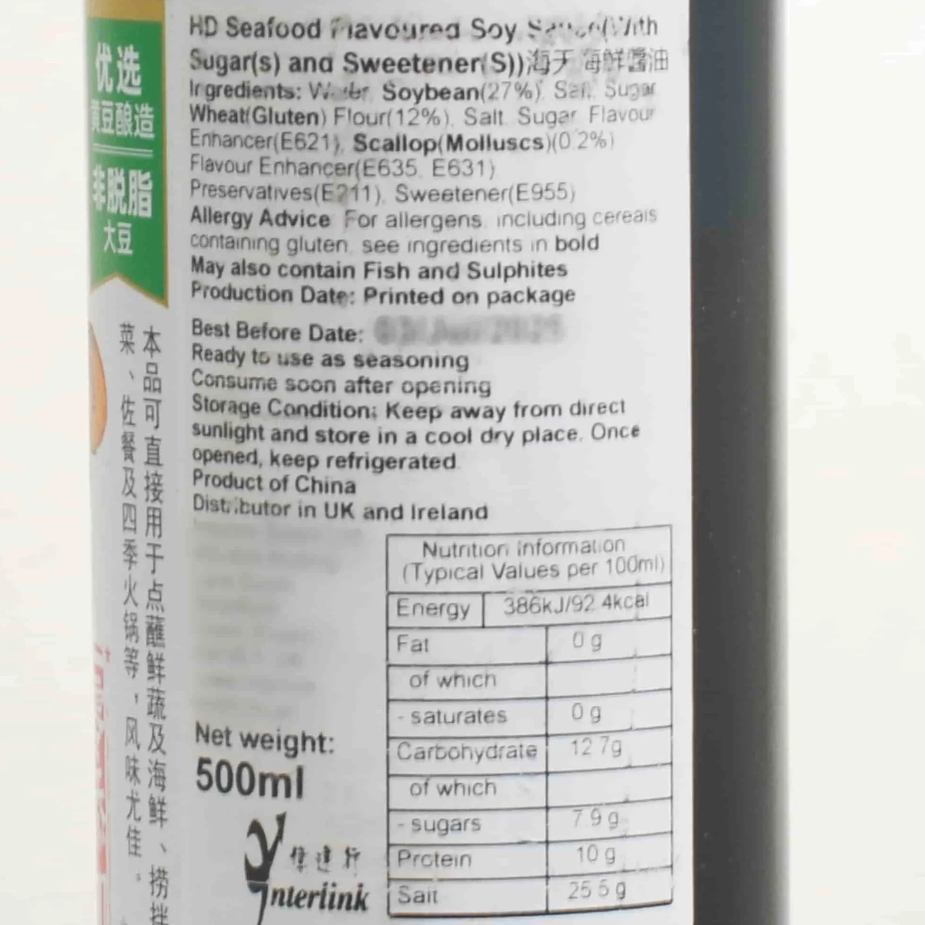 Product formulations and details may change. For the latest ingredients and allergen information always check product packaging prior to consumption. Ingredients: Water, soybeans, wheat, salt, sugar, monosodium glutamate, dried scallop, disodium 5′-ribonucleotide, disodium 5′-inosinate, sodium benzoate, sucralose