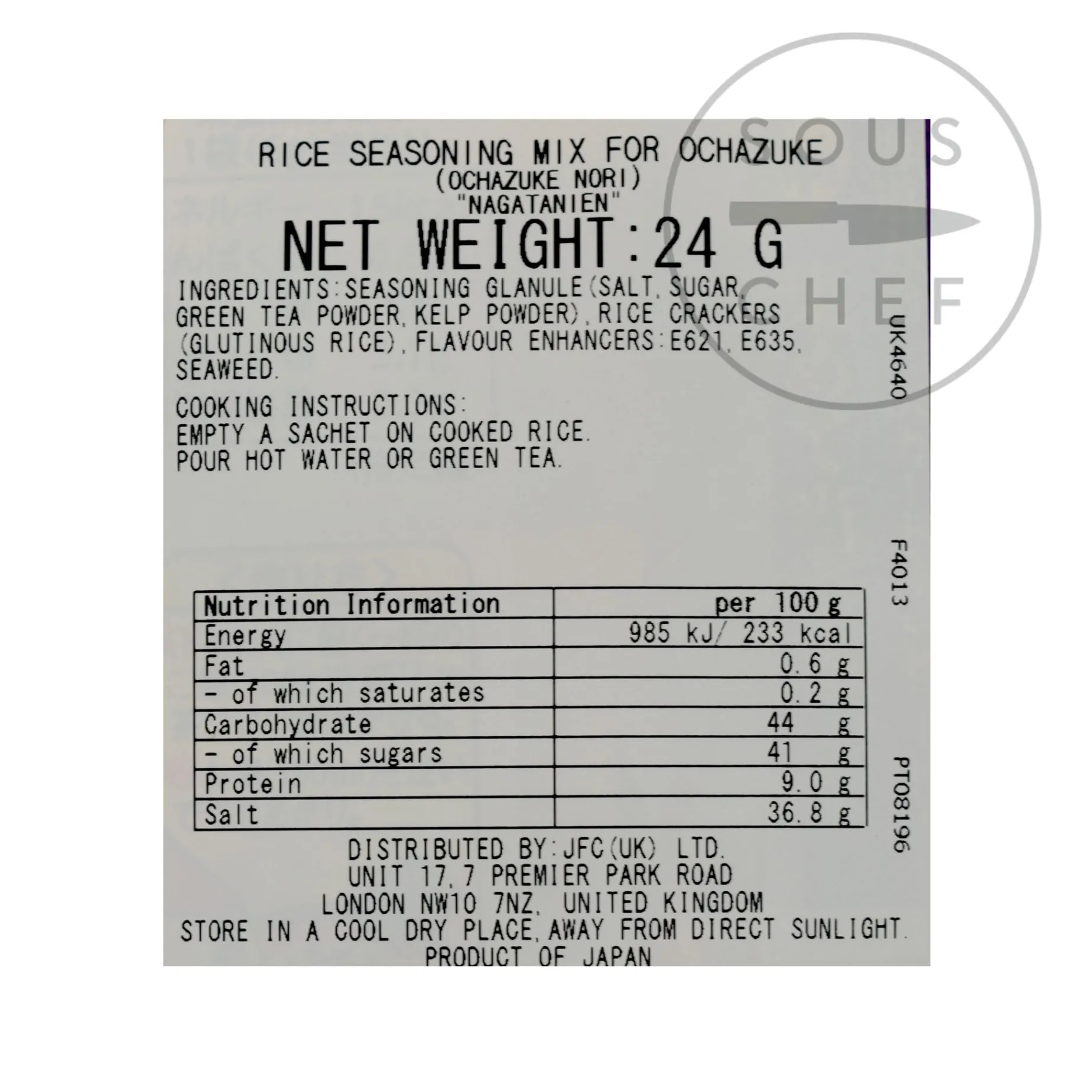 The tasty seasoning mix blends crunchy rice crackers with strips of dried nori seaweed, and umami-rich kelp. Traditionally green tea or dashi stock would be poured over the seasoned rice – and this seasoning includes green tea powder for that extra boost.