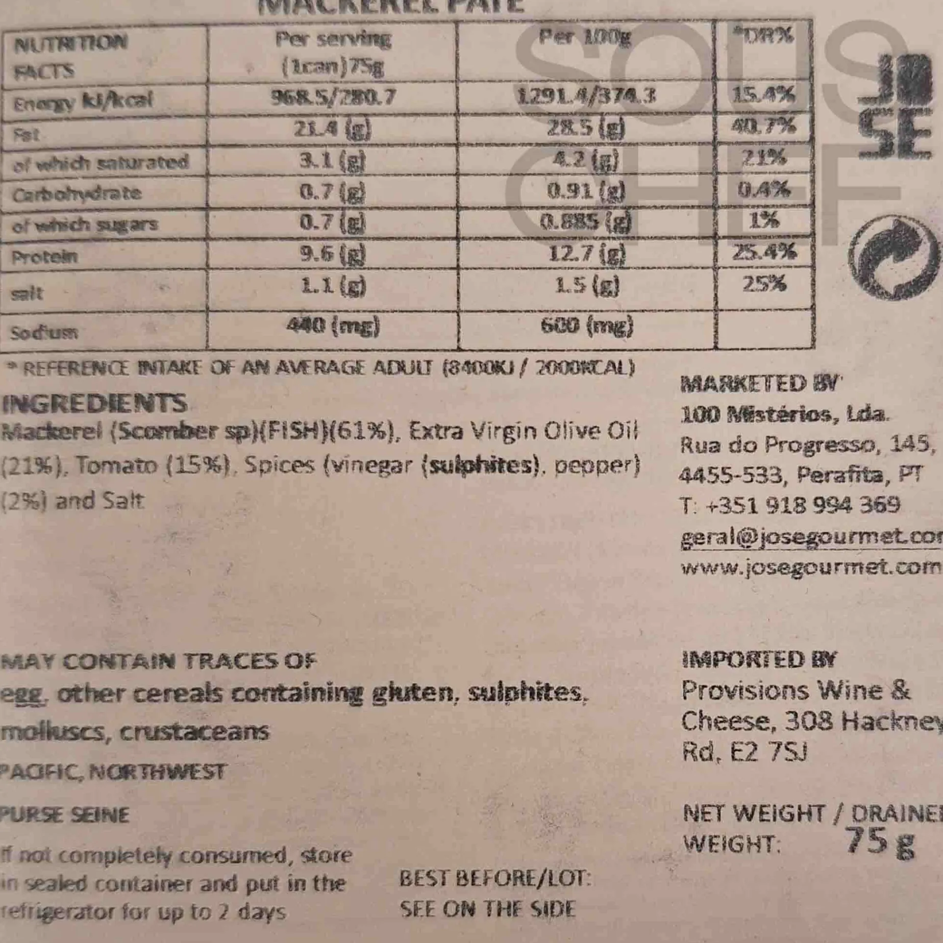 Spread José Gourmet mackerel pâté on crackers or crusty bread. Produced in Portugal, it has a rich salty savoury flavour. Enjoy it on its own or add chopped gherkins and a squeeze of lemon.