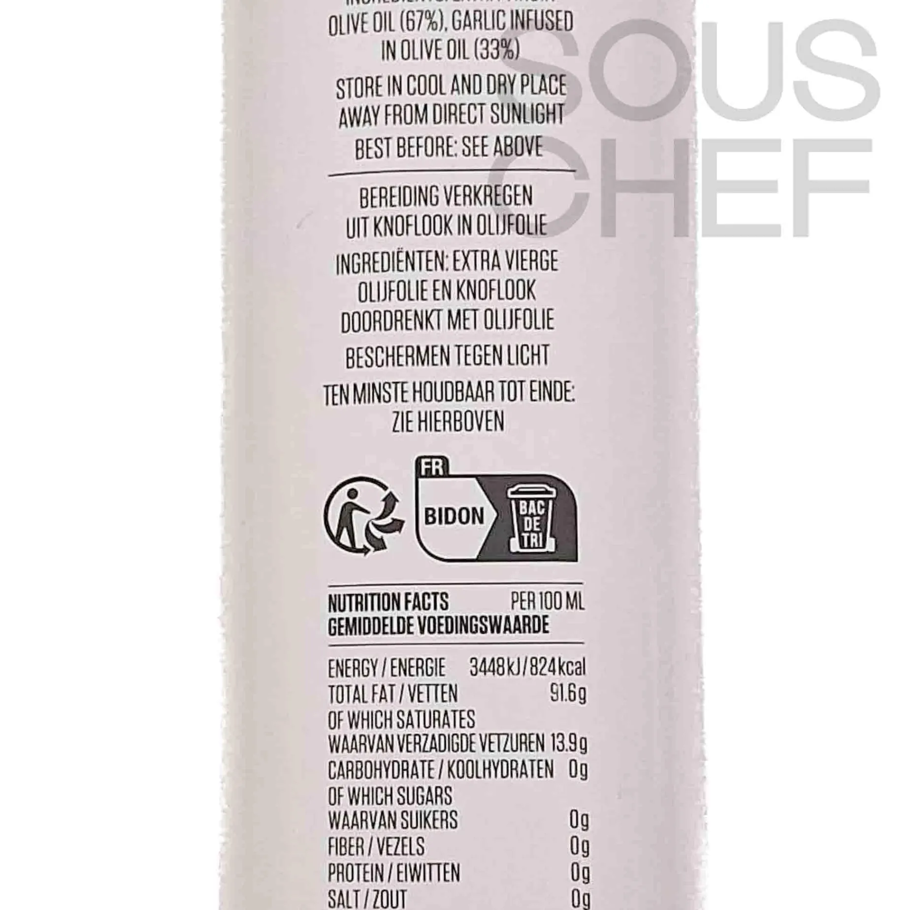 Product formulations and details may change. For the latest ingredients and allergen information always check product packaging prior to consumption. Ingredients: Extra virgin olive oil (67%), garlic infused in extra virgin olive oil (33%)