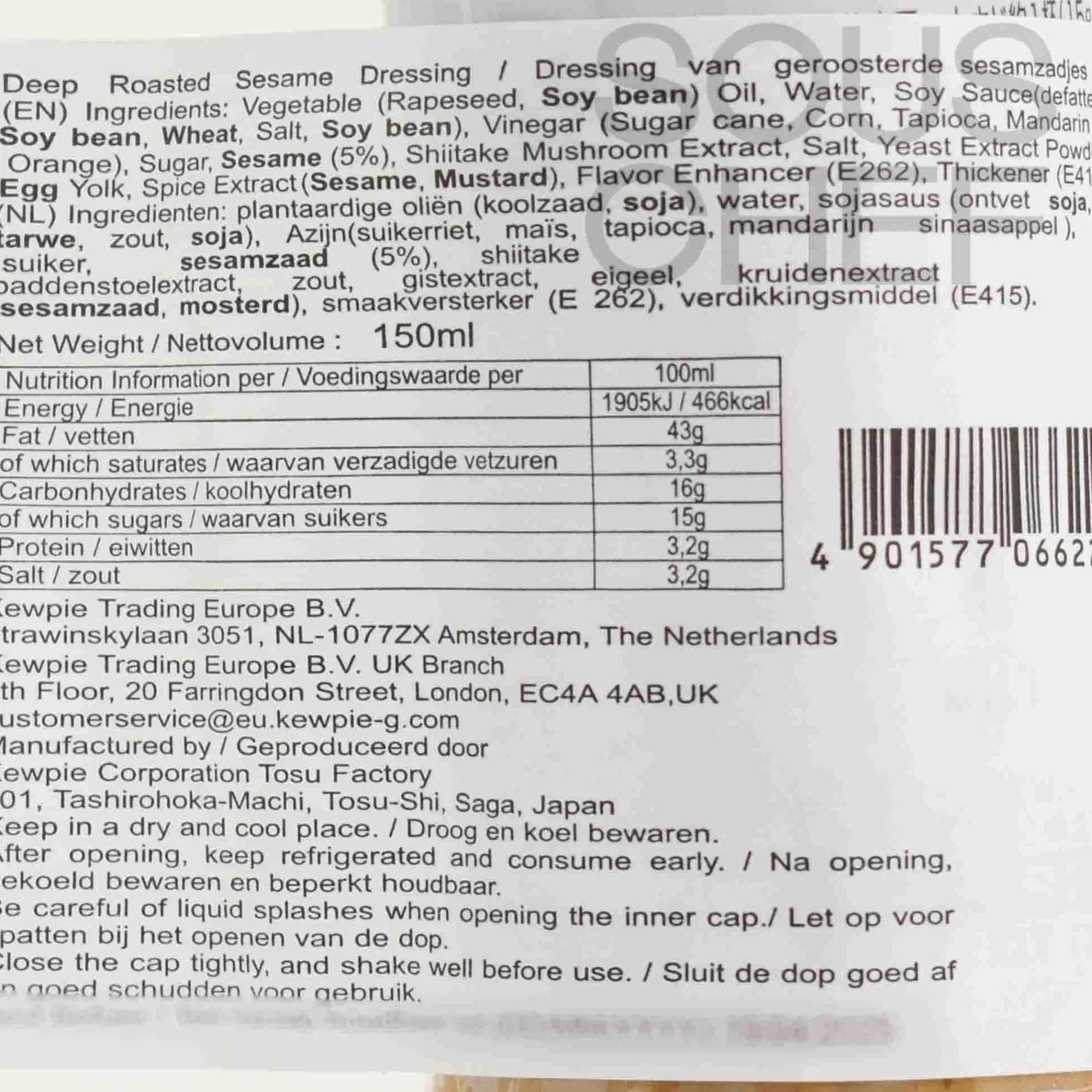 Product formulations and details may change. For the latest ingredients and allergen information always check product packaging prior to consumption. Ingredients: Vegetable (rapeseed, soybean) oil, water, soy sauce (defatted soybean, wheat, salt, soybean, barley (gluten)), vinegar (sugar cane, corn, tapioca, mandarin orange), sugar, sesame (5%), shiitake mushroom extract, salt, yeast extract powder, egg yolk, spice extract (sesame, mustard), flavor enhancer (e262), thickener (e415).