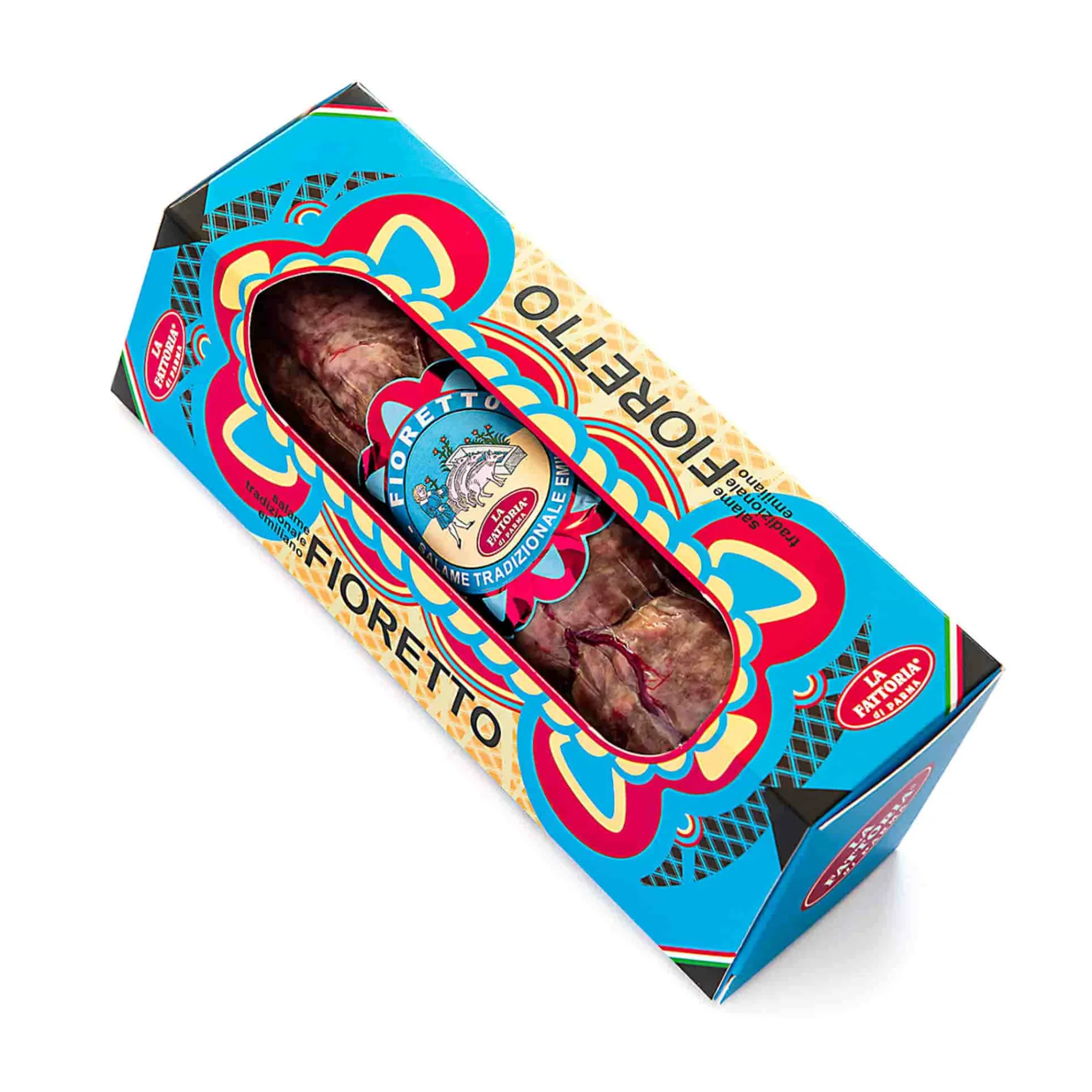 Fioretto salami is native to Emilia-Romagna, a region of northern Italy that is famous for its excellent food and wine. The salami is hand-bound so that the end resembles a flower (fiore in Italian) and is left to cure for no less than 40 days. Fioretto salami is made with top quality pork flavoured with salt, pepper and spices like cinnamon, cloves and nutmeg. The result is a salami that is delicate but well-seasoned, with a light, sweet flavour.
