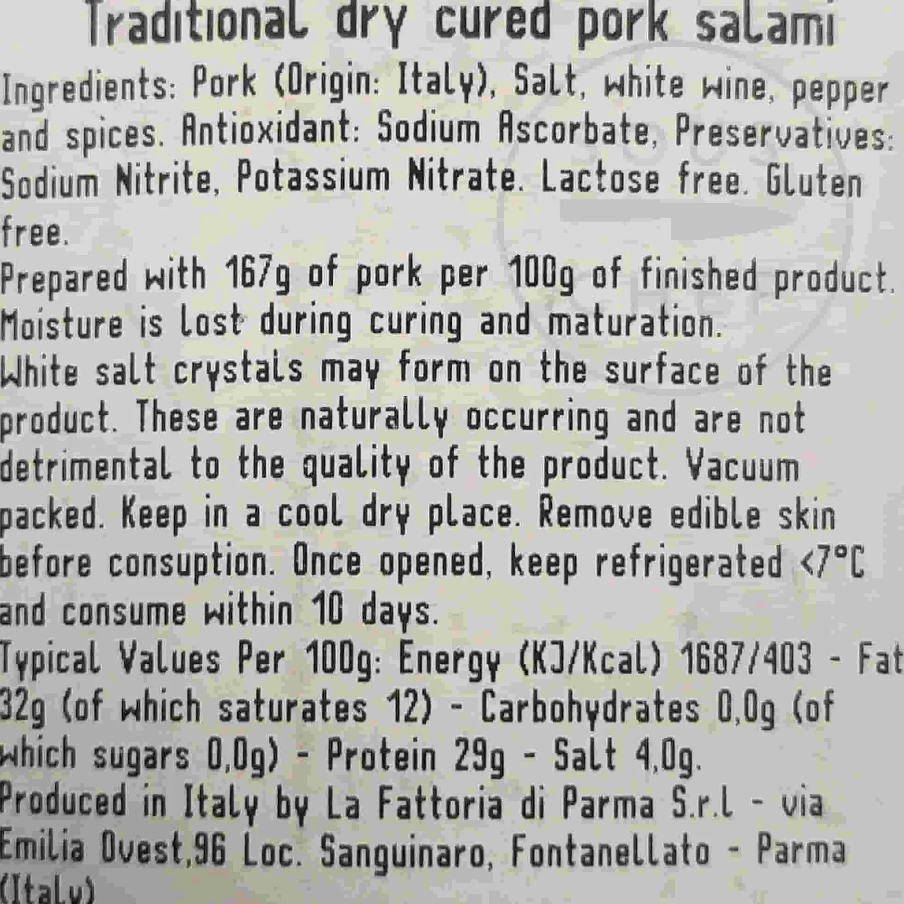 To serve traditionally, carve on the diagonal into thin slices and enjoy with a glass of red wine or a cold beer. Produced by La Fattoria di Parma, a family-owned company based in northern Italy, this premium salami makes a delicious snack or picnic treat.
