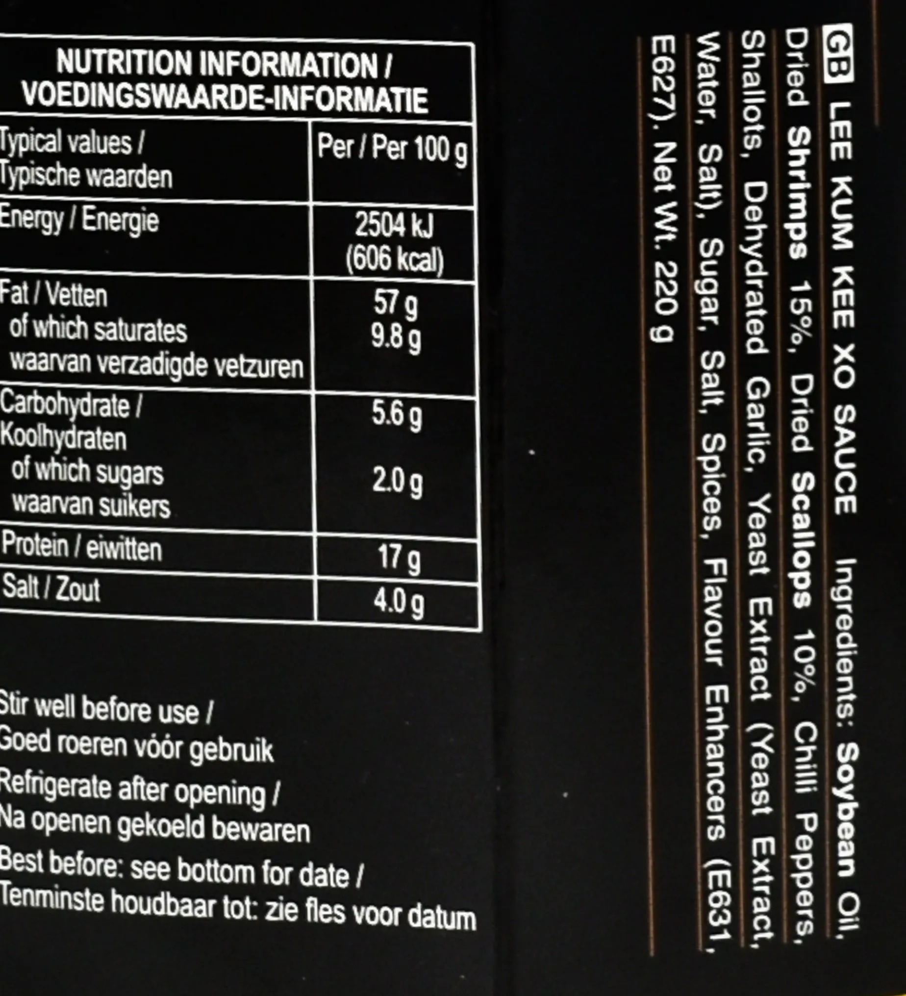 Product formulations and details may change. For the latest ingredients and allergen information always check product packaging prior to consumption. Ingredients: soybean oil, dried shrimps (15%), dried scallops (10%), chilli peppers, shallots, dehydrated garlic, yeast extract (yeast extract, water, salt), sugar, salt, spices, flavour enhancers (E631, E627).