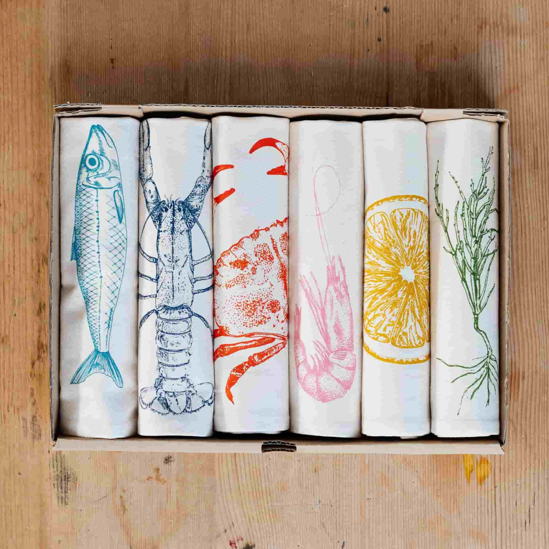 This set of six seafood napkins is a wonderful housewarming gift and a fun addition to your own dining table. Handmade in the UK, the elegant white napkins feature screen-printed illustrations of colourful sea creatures. Each serviette has a unique design – choose from crab, prawn, mackerel, blue lobster, samphire or lemon. Made from natural cotton, these napkins are ideal for everyday use or to dress your table for dinner parties, especially if fish is on the menu!