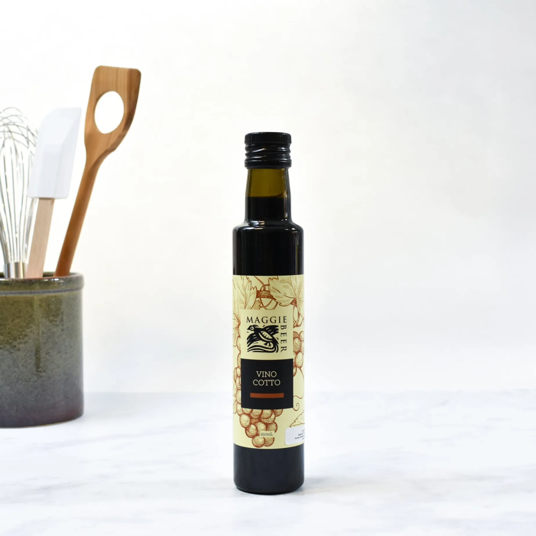 Vino Cotto is a unique sweet/sour or agrodolce dressing, which works in any situation where you might otherwise use balsamic vinegar. Inspired by Mediterranean cuisine, famous Australian chef Maggie Beer started producing the vino cotto at her vineyard in the Barossa Valley. Vino cotto is produced by heavily reducing grape must or juice to make a rich syrupy dressing.