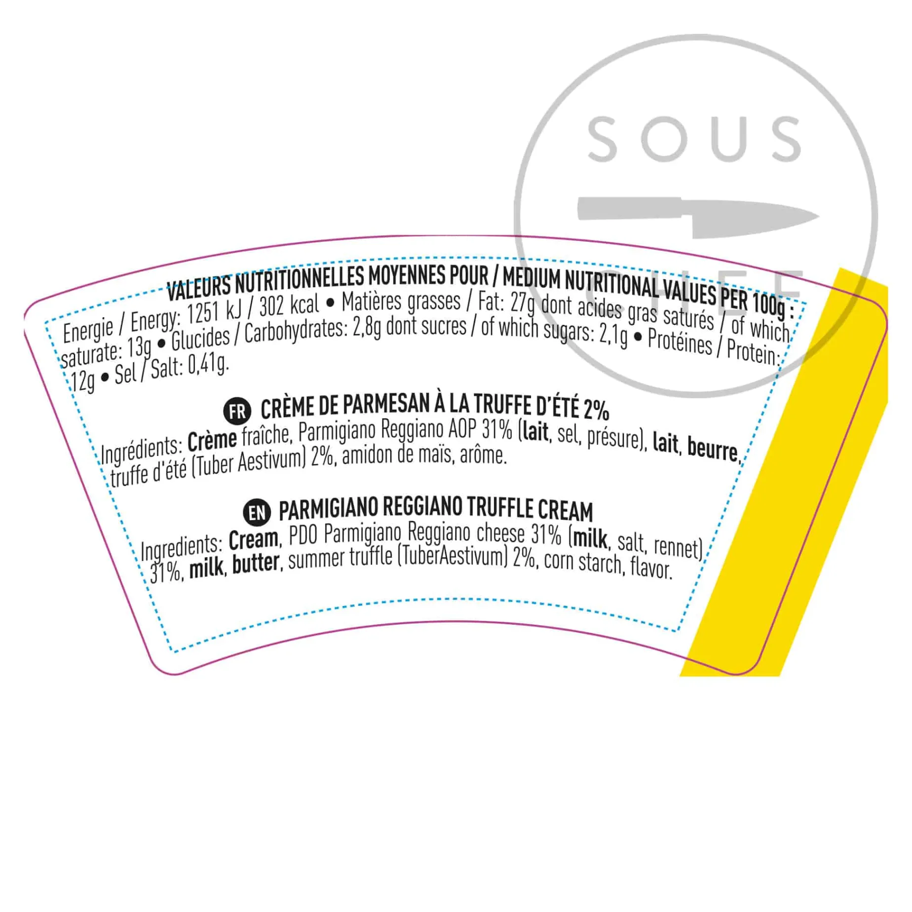 Product formulations and details may change. For the latest ingredients and allergen information always check product packaging prior to consumption. Ingredients: Cream (milk), PDOParmigiano Reggiano cheese 31%, (milk, salt, rennet), 31%, milk, butter (milk), summer truffle 2% (tuber aestivum), corn starch, flavour.
