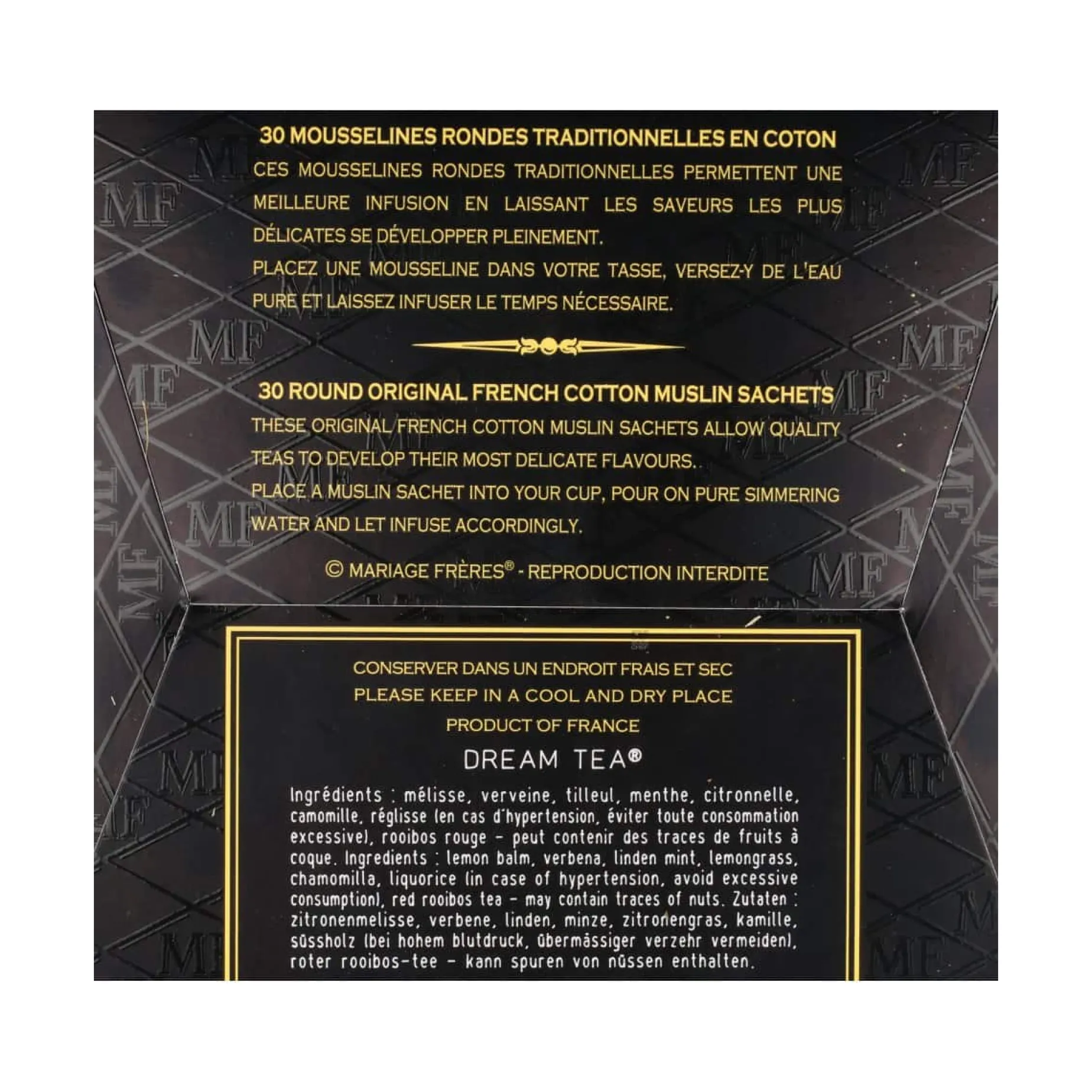 Mariage Frères pairs rooibos with eight soothing herbs. The tea is fragrant and full-bodied with notes of citrusy verbena and lemongrass. The flavour is brightened by a burst of peppermint and liquorice.