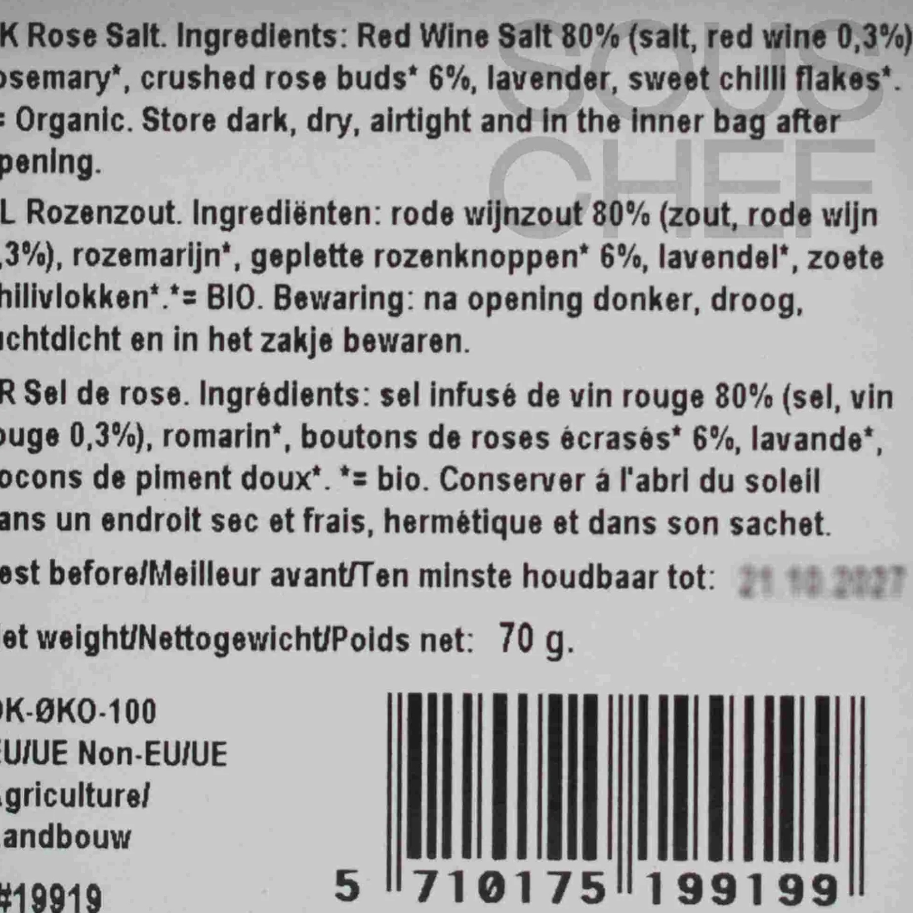 Product formulations and details may change. For the latest ingredients and allergen information always check product packaging prior to consumption. Ingredients: Red wine salt (40%), red wine (0.3%), rosemary*, crushed rose buds*( 6%), lavender*, sweet chili flakes*. *=organic