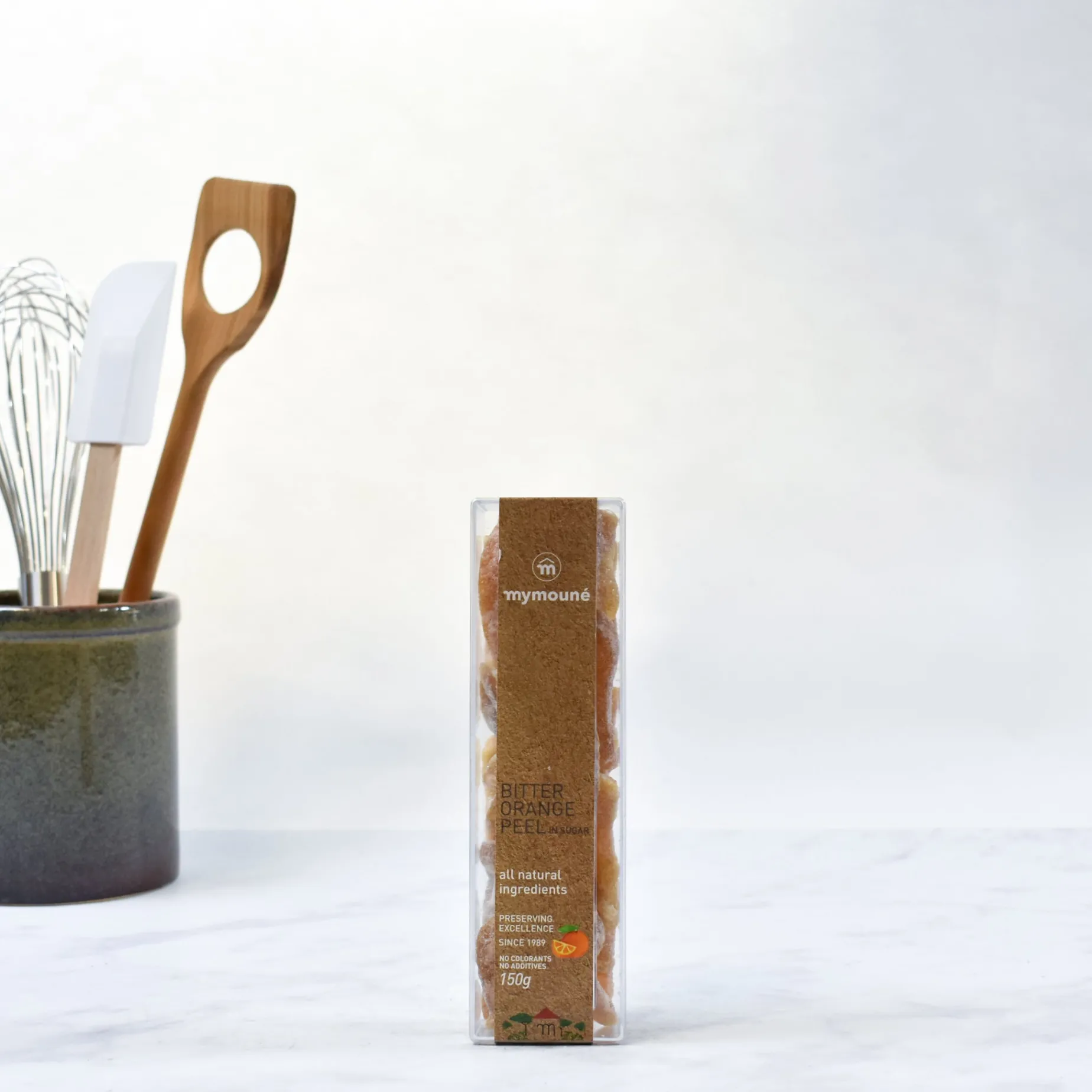 Mymouné’s Sugared Bitter Orange Peel is fabulous preserved candied fruit. If you can stop yourself from munching a whole packet of Mymouné’s Sugared Bitter Orange Peel all in one go, try dipping them in melted dark chocolate. Once cool, serve them with strong coffee – the bitter-sweetness will complement the coffee perfectly. Try chopping the peel and adding it to a carrot cake in place of orange zest. These strips of sugared peel are also fantastic as cake decorations, either cut into small pieces or left whole.