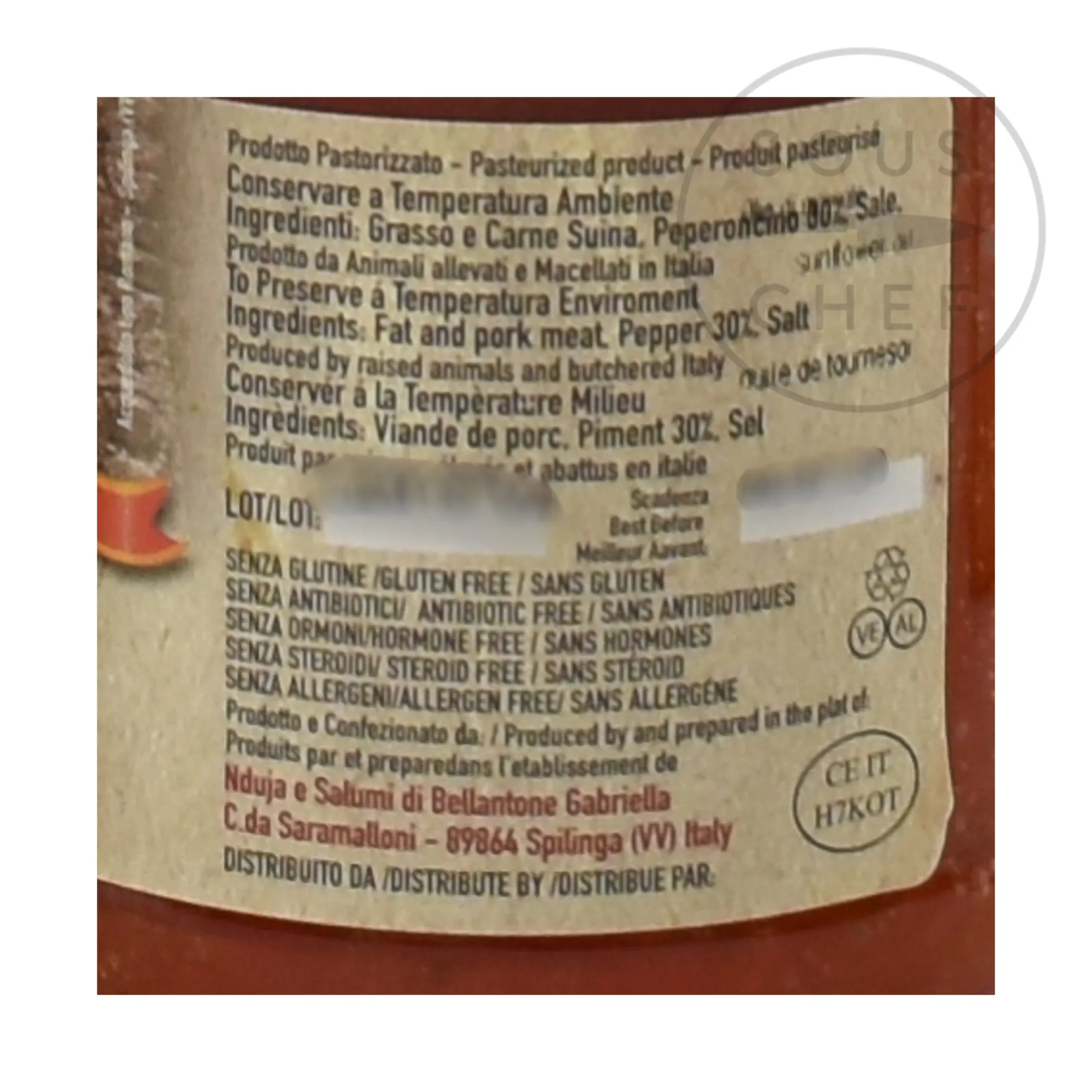 ‘Nduja is primarily made from pork meat and fat, generously spiced with fiery red peppers for heat and flavor. Salt is added for preservation and to enhance the taste. This mixture is finely ground, allowed to ferment, and then aged to develop its characteristic soft, spreadable texture and robust flavor.