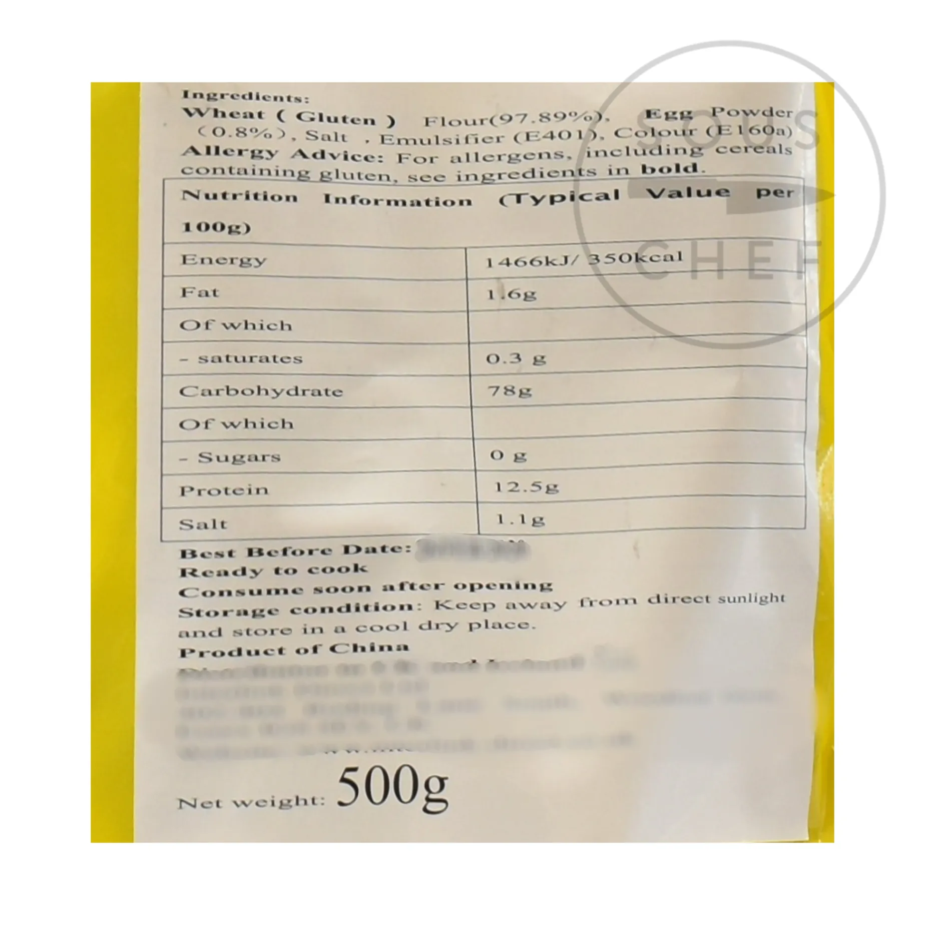 Product formulations and details may change. For the latest ingredients and allergen information always check product packaging prior to consumption. Ingredients: Wheat (gluten) flour (97.89%), salt, egg powder (0.8%), emulsifier (E401), colour (E160a).