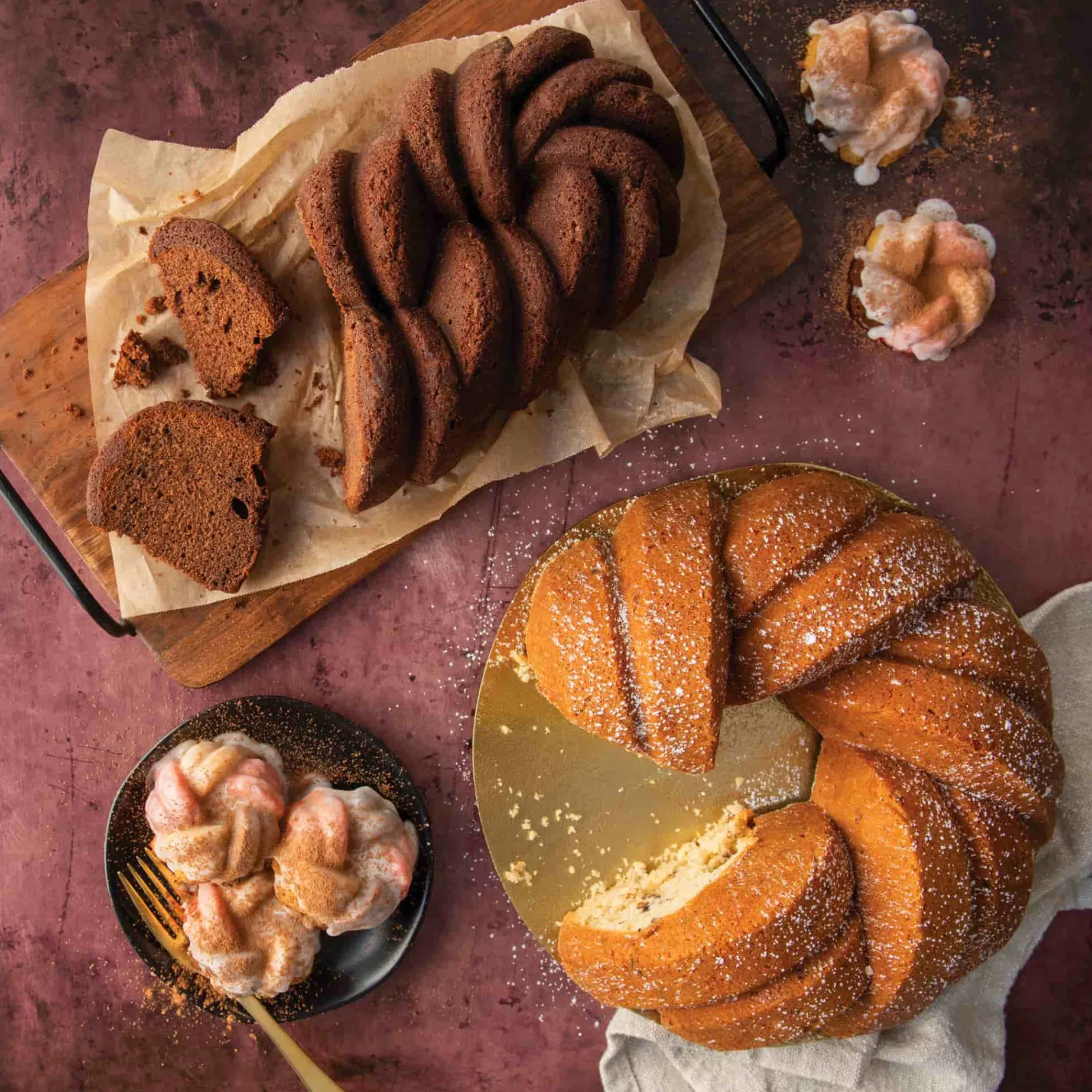 A Bundt cake is a traditional American doughnut-shaped cake. Inspired by German Bundkuchen, Bundt cakes do not have specific recipes but share common features in style. They are baked in a Bundt pan – a ring-shape with a hole in the middle and traditionally have fluted or grooved edges. A spiced cake batter is often used, but Bundt cakes are enjoyed in a range of flavours, from rich chocolate to fruity sponges.