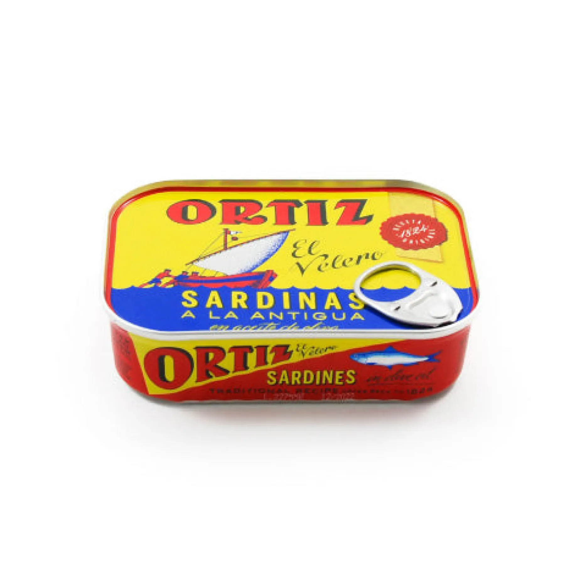 Enjoy sardines a la antigua in olive oil straight from the tin. Ortiz pick the freshest sardines from auctions on the north coast of Spain, then carefully clean and prepare them by hand. The sardines are quickly fried in virgin olive oil, before being tinned with olive oil and a little salt. Try lightly toasting slices of fresh, crusty bread, top with crushed tomatoes and garlic, and finally place a single sardine on top. Enjoy as a starter or snack.