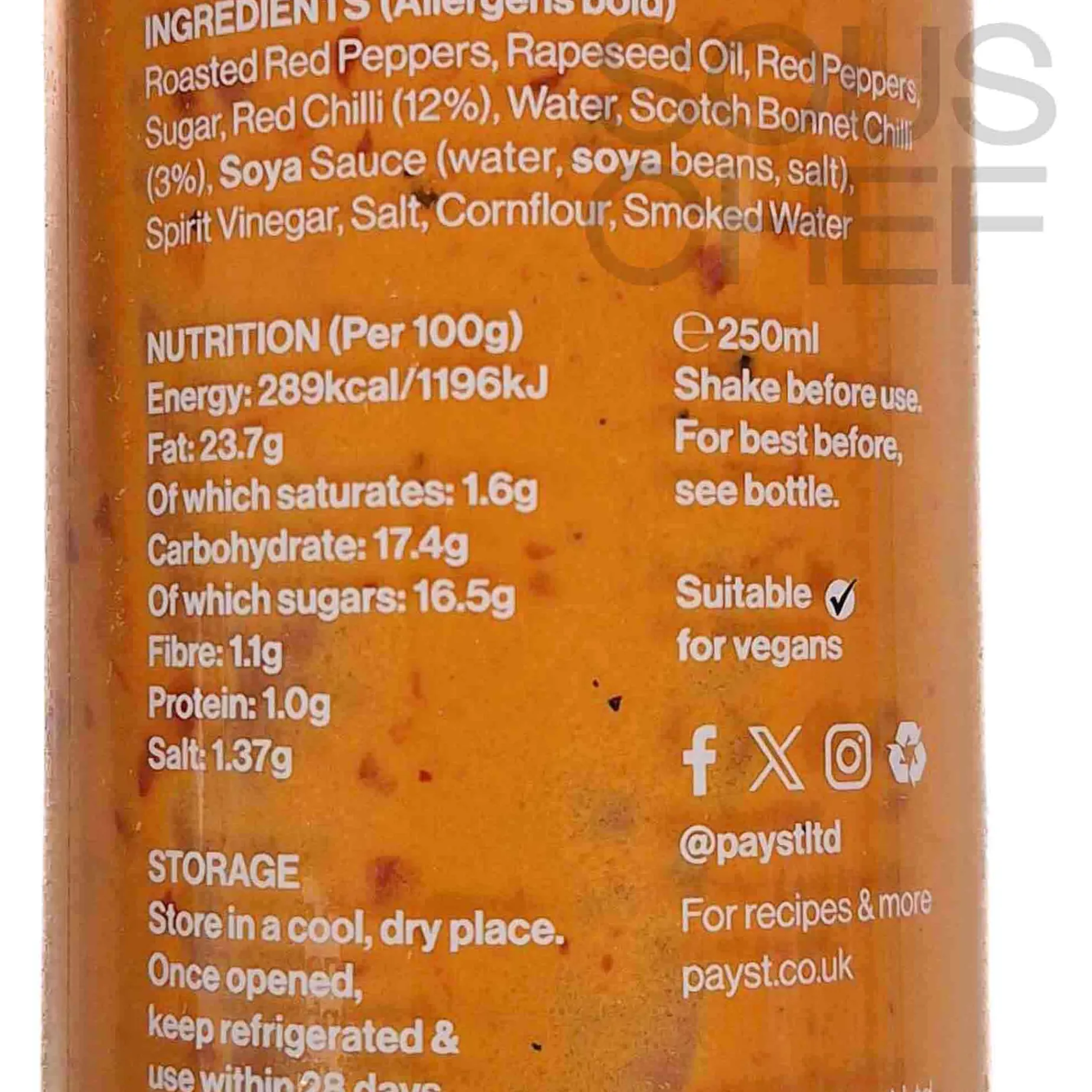 Product formulations and details may change. For the latest ingredients and allergen information always check product packaging prior to consumption. Ingredients: Roasted red bell peppers, rapeseed oil, red peppers, sugar, long red chilli, scotch bonnet chilli, water, gluten free soy sauce (water, soybean, salt) white vinegar, salt, cornflour, smoked water