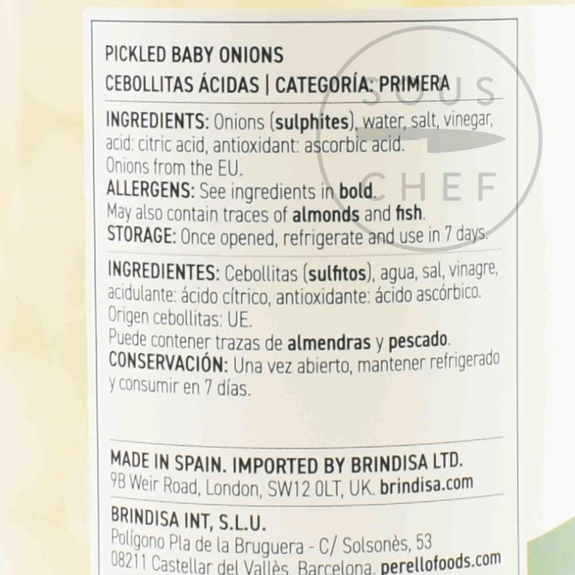 Product formulations and details may change. For the latest ingredients and allergen information always check product packaging prior to consumption. Ingredients: Onions (sulphites), water, salt, vinegar, acid: citric acid, antioxidant: ascorbic acid.