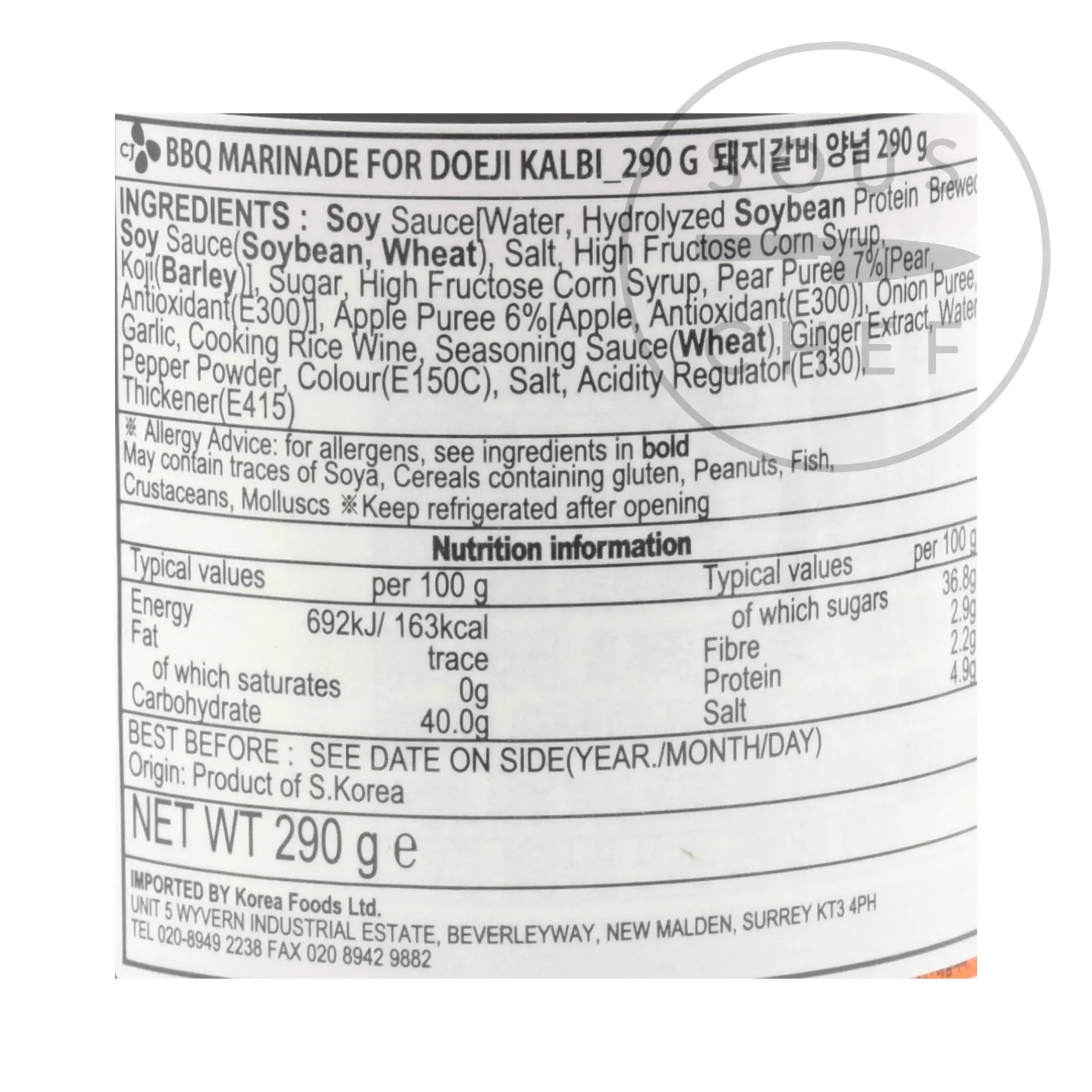 Product formulations and details may change. For the latest ingredients and allergen information always check product packaging prior to consumption. Ingredients: Soy sauce [(water, hydrolyzed soybean protein, brewed soy sauce (soybean, wheat) salt, high fructose corn syrop, koji (barley)], sugar, high fructose corn syrup, pear puree (7%) [pear antioxidant (E300)], apple puree 6% [apple, antioxidant (E300)], onion puree, garlic, cooking rice wine, seasoning sauce (wheat), ginger extract, water, pepper powder, colour (E150c), salt, acidity regulator (E330), thickerner (E415).