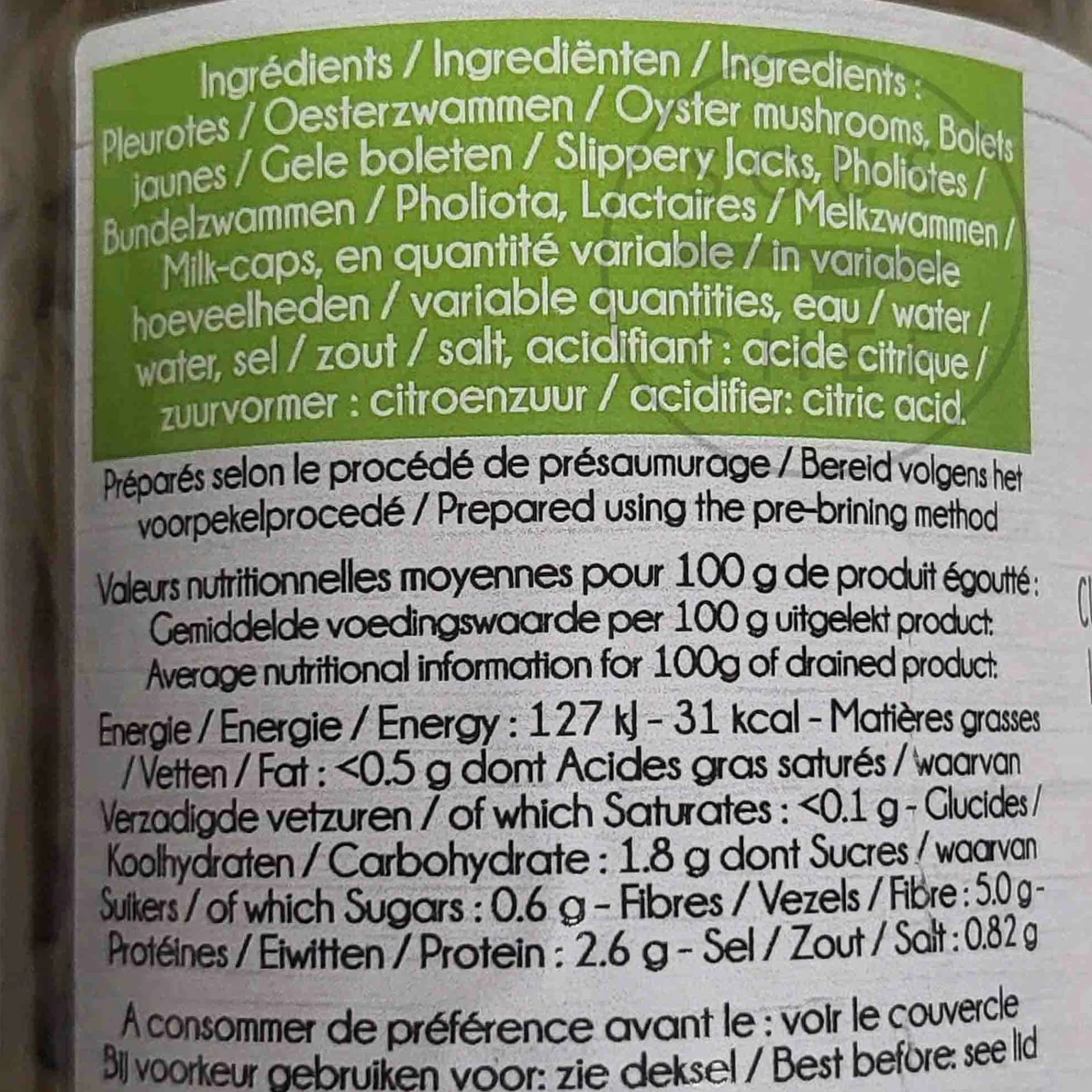 Product formulations and details may change. For the latest ingredients and allergen information always check product packaging prior to consumption. Ingredients: Oyster mushrooms (pleurotus ostreatus), yellow bolets (suillus luteus or granulatus), pholiotes (pholiota mutabilis), milk-caps (lactarius deliciosus), water, salt, acidifying agent: citric acid.