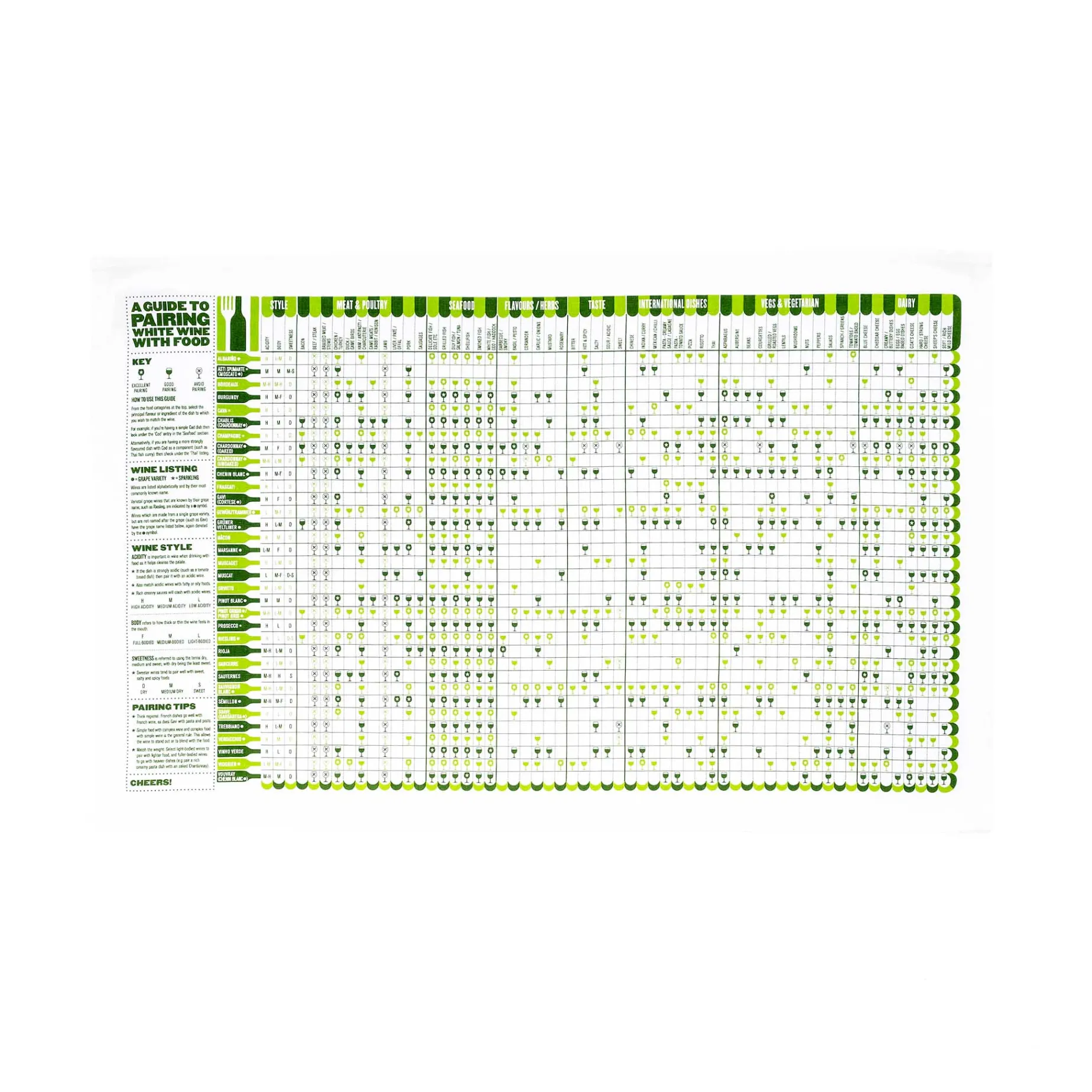 Stuart Gardiner’s ‘White Wine & Food Pairing Guide’ tea towel guides you through the intricate world of wine pairing, and matches 34 white wine styles with over 50 different dishes. From global cuisines to specific ingredients such as goat’s cheese or smoked fish – use this bright and vibrant guide to find the perfect bottle for every meal.
