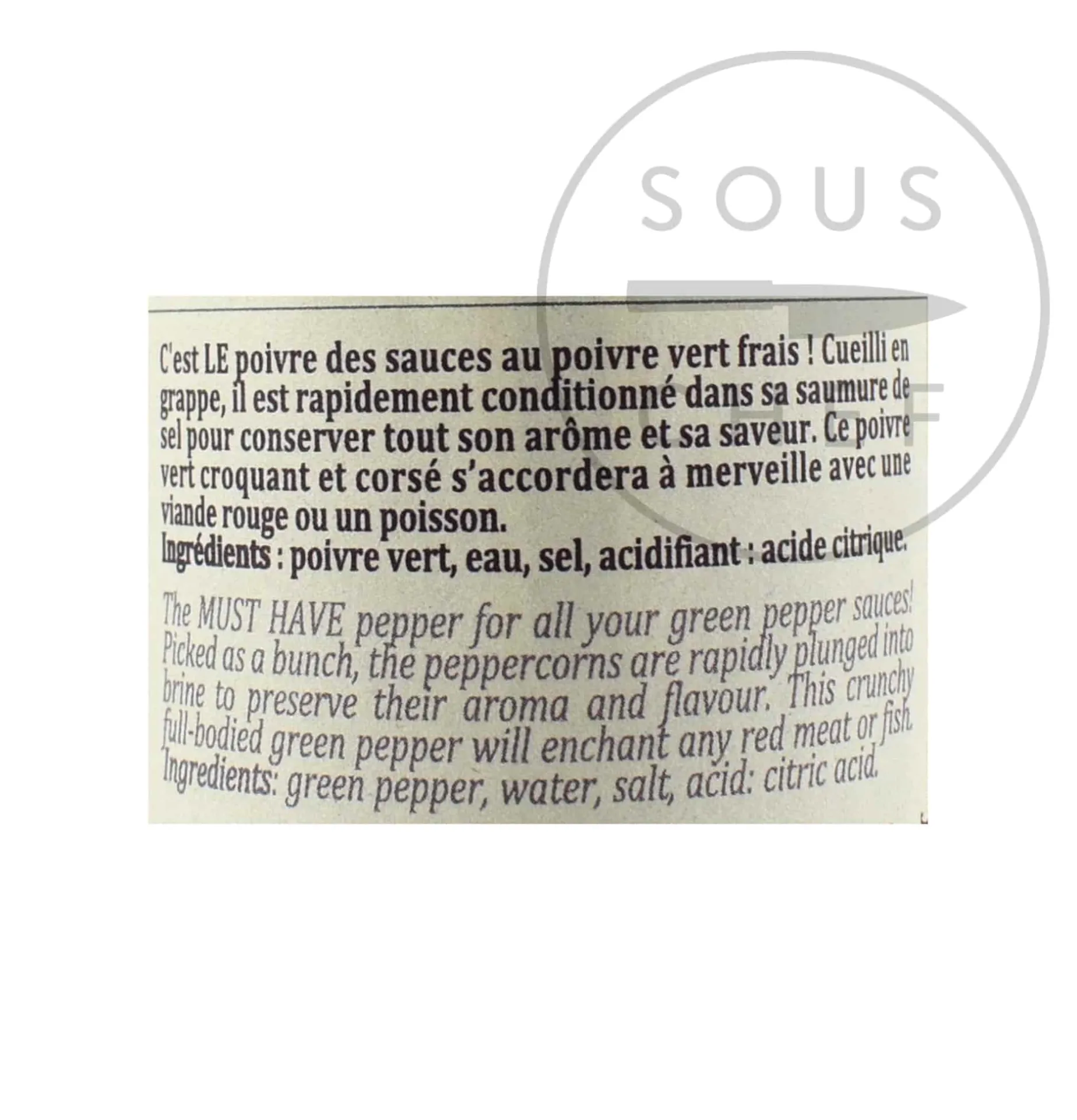 Product formulations and details may change. For the latest ingredients and allergen information always check product packaging prior to consumption. Ingredients: Green Madagascar pepper, water, salt, acid: citric acid.