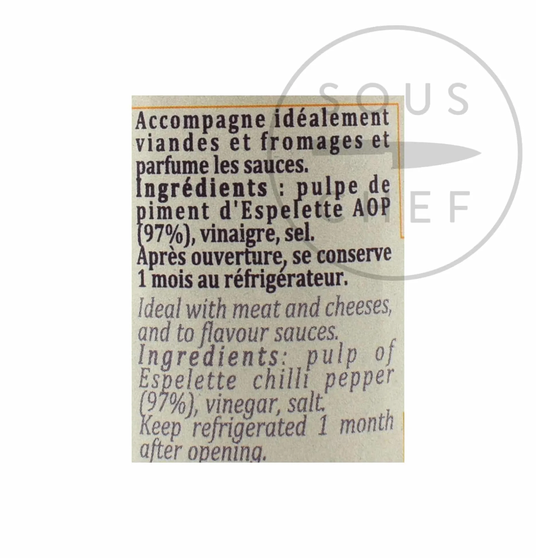 Product formulations and details may change. For the latest ingredients and allergen information always check product packaging prior to consumption. Ingredients: Espelette chili pepper, vinegar (2%), salt (2%)