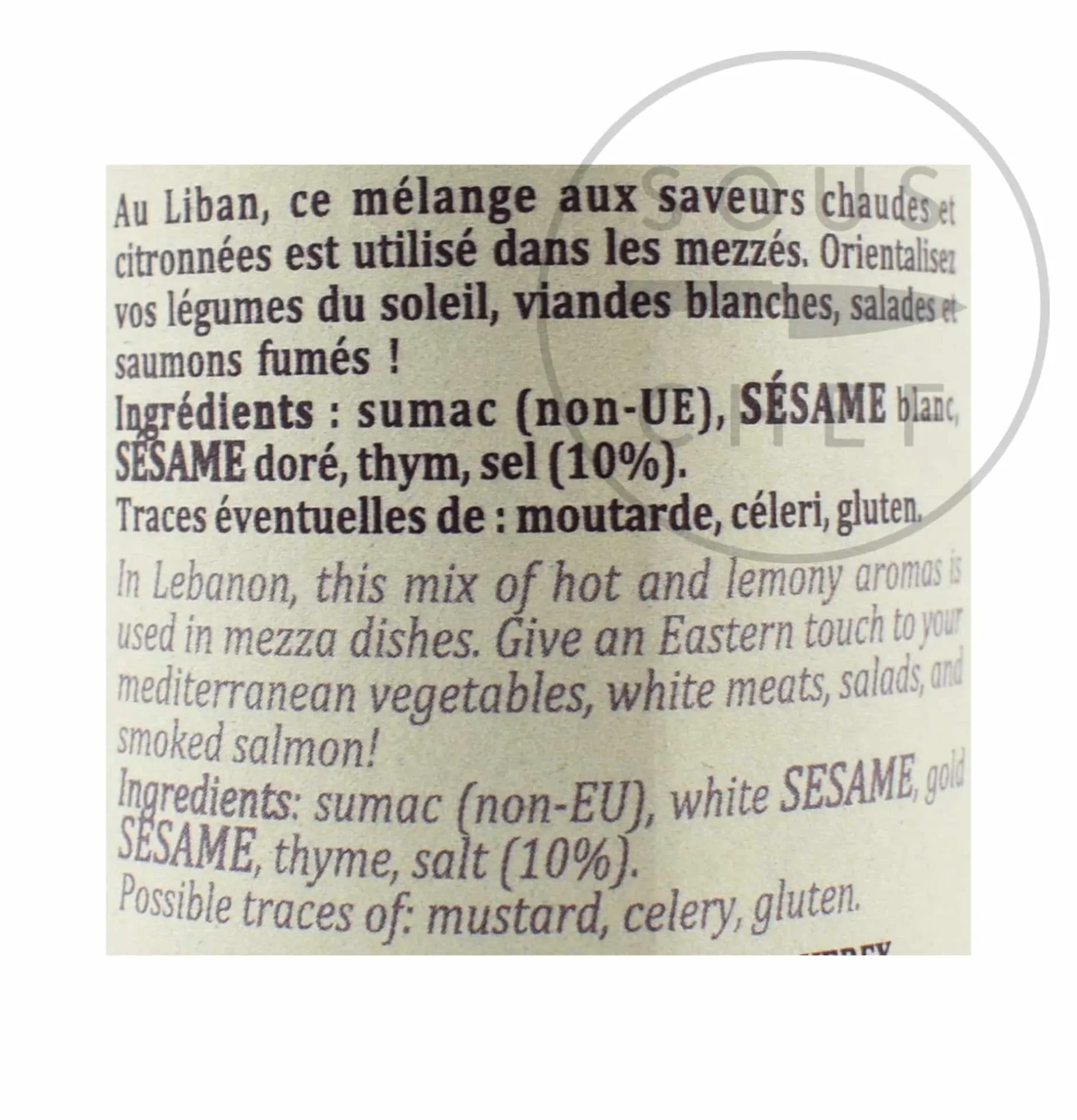 Product formulations and details may change. For the latest ingredients and allergen information always check product packaging prior to consumption. Ingredients: sumac (non EU), white sesame, gold sesame, thyme, salt (10%).