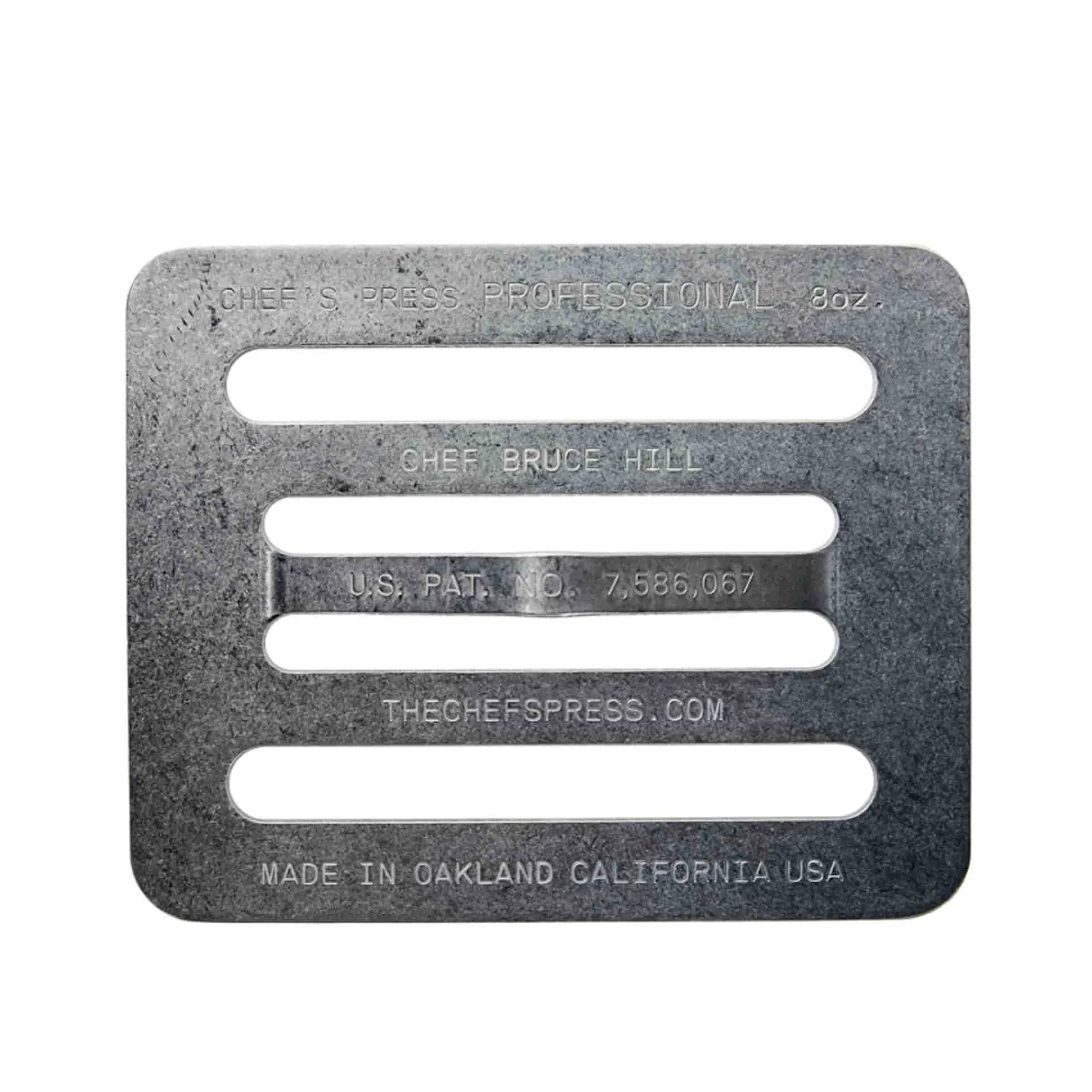 The Chef’s Press was created by Chef Bruce Hill while he was working in a tiny kitchen of Bix Restaurant in San Francisco. The traditional cast iron weights were too heavy for many dishes and also trapped steam.